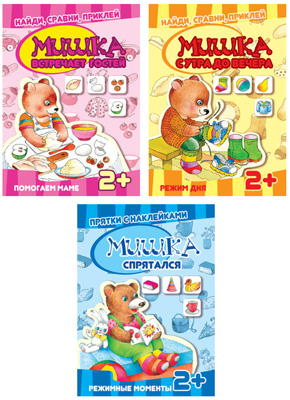 Найди, сравни, приклей. Мишка с утра до вечера: Режим дня. Многоразовые наклейки для детей от 2 лет