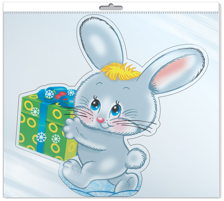 *ФМ-14453 ПЛАКАТ ВЫРУБНОЙ А4 В ПАКЕТЕ. Зайчик с подарком (УФ-лак, в индивидуальной упаковке, с европодвесом и клеевым клапаном)