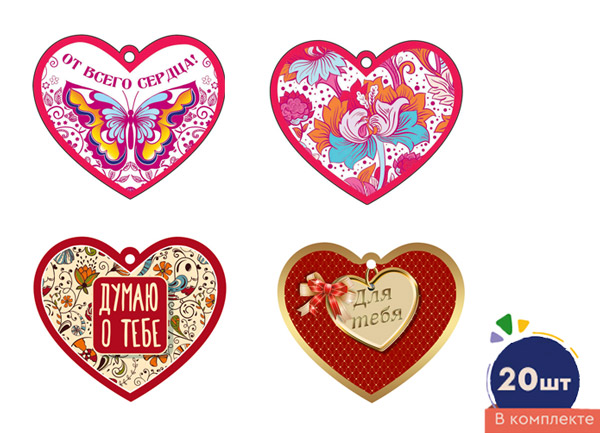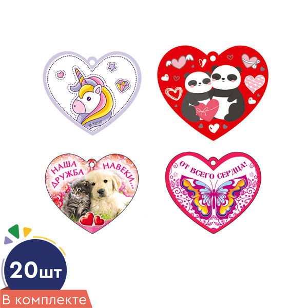 *КМ-17221 Комплект сердечек одинарных на скотче для украшения подарков (20 шт.: 4 вида по 5 шт.)