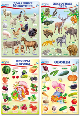 Комплект познавательных мини-плакатов. Домашние, лесные животные, фрукты и ягоды, овощи (4 листа А4+, текст на обороте)
