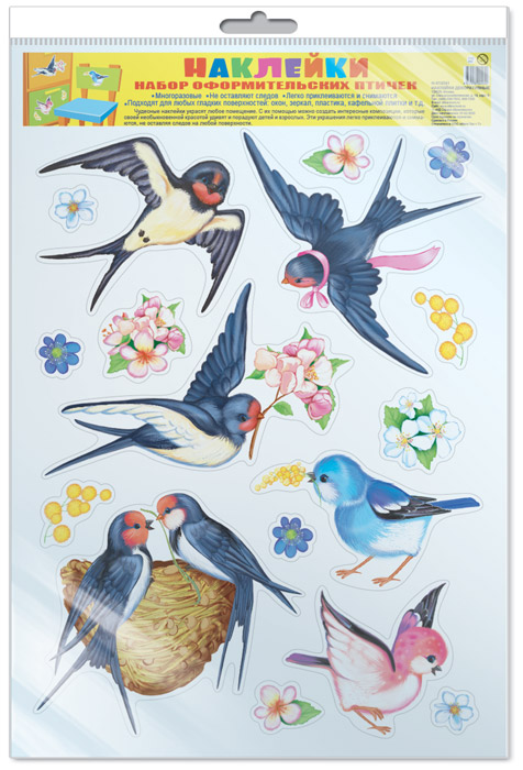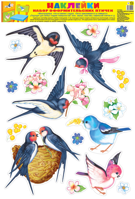 Н-13241 Наклейки А3+. Набор оформительских птичек с цветами (многоразовые, УФ-лак)