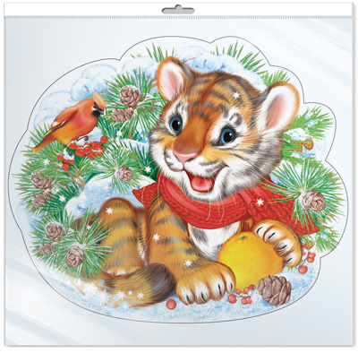 *ФМ1-12940 ПЛАКАТ ВЫРУБНОЙ А4 В ПАКЕТЕ. Тигренок в дарах зимы (УФ-лак, в индивидуальной упаковке, с европодвесом и клеевым клапаном)