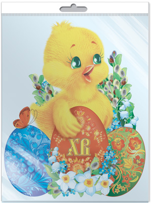 *ФБ-13210 ПЛАКАТ ВЫРУБНОЙ А2 В ПАКЕТЕ. Цыпленок с пасхальными яйцами (УФ-лак, в индивидуальной упаковке, с европодвесом и клеевым клапаном)