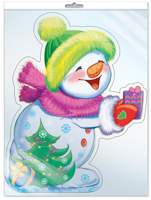 *ФМ-13427 ПЛАКАТ ВЫРУБНОЙ А4 В ПАКЕТЕ. Снеговик (блестки в лаке, в индивидуальной упаковке, с европодвесом и клеевым клапаном)