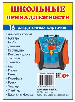 Дем. картинки СУПЕР Школьные принадлежности. 16 раздаточных карточек с текстом на обороте (учебно-методическое пособие с комплектом демонстрационного материала 63х87 мм, познавательное и речевое развитие)